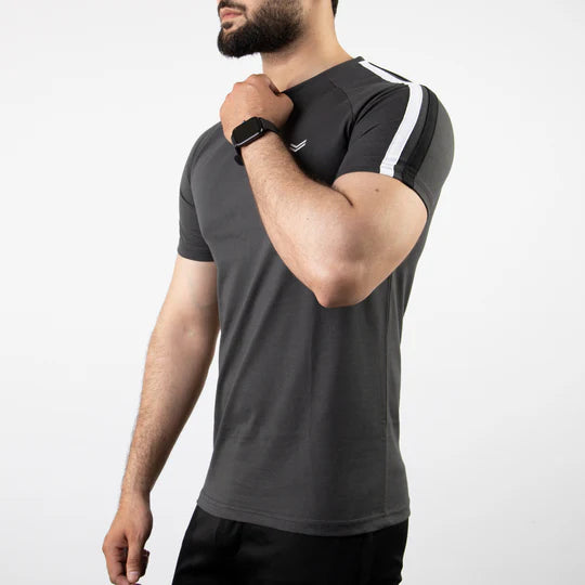 Dark Gray T-Shirt with White & Black Shoulder Stripes